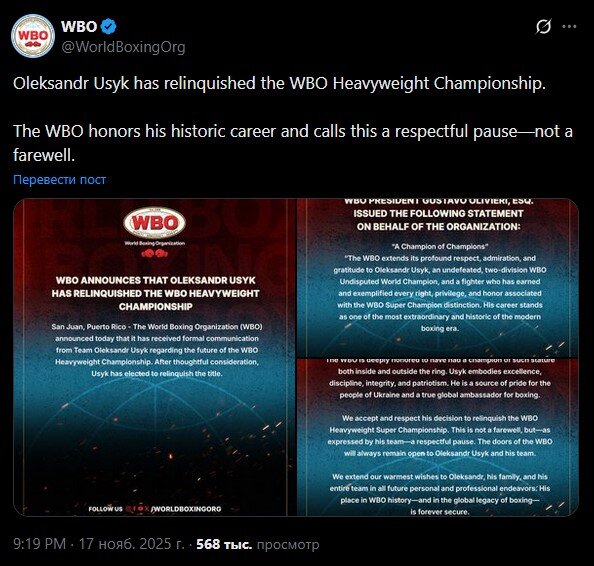 Про рішення оголосила Всесвітня боксерська організація, підкресливши, що Усик сам відмовився від титулу після розмови з керівництвом WBO. У заяві наголошується: це не прощання, а "поважна пауза" для спортсмена, який здійснив історичний шлях у боксі.